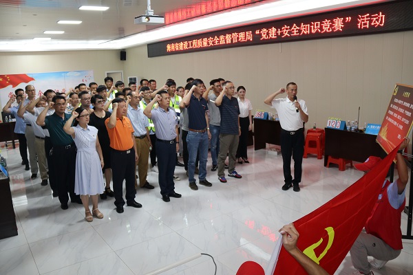為推進(jìn)基層黨組織聯(lián)建共建,深入開展全國“安全生產(chǎn)月”活動,落實(shí)公司關(guān)于安全生產(chǎn)工作的要求,牢固樹立安全發(fā)展理念,七一前夕,海南萬泰公司組織隊伍參加了由海南省建設(shè)工程質(zhì)量安全監(jiān)督管理局舉辦的“黨建+安全知識競賽”活動,省廳張運(yùn)臻處長,省質(zhì)安局陳雷書記、劉長征副局長等有關(guān)領(lǐng)導(dǎo)參加活動。