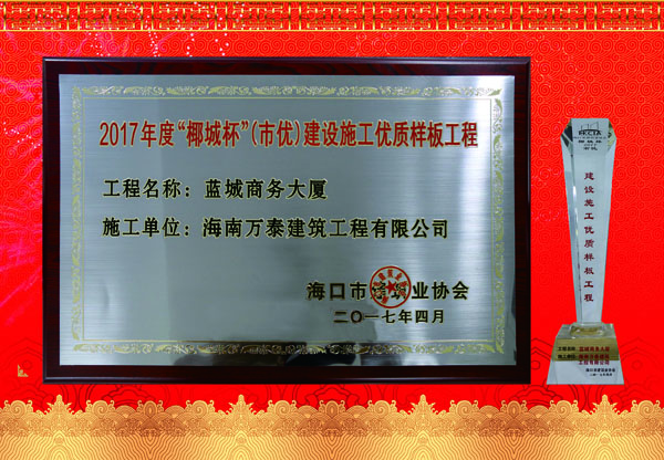 2015年3月,由萬泰承建的【藍城商務大廈】工程,榮獲海南省建設工程質(zhì)量安全檢測協(xié)會頒發(fā)的2015年度《海南省建筑施工優(yōu)質(zhì)結構工程》。