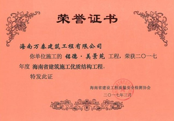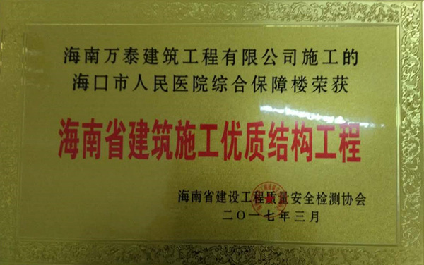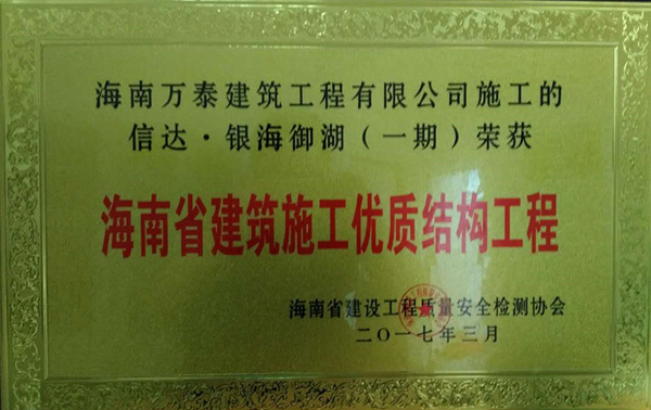 2017年6月20日,經(jīng)過了長(zhǎng)期的嚴(yán)格評(píng)審之后,由海南萬泰承建的??谑腥嗣襻t(yī)院綜合保障樓、瓊海信達(dá)銀海御湖(一期)、銘德.美景苑三個(gè)項(xiàng)目全部通過基礎(chǔ)、主體階段的評(píng)審,并榮獲海南省建設(shè)工程質(zhì)量安全檢測(cè)協(xié)會(huì)頒發(fā)的《海南省建筑施工優(yōu)質(zhì)結(jié)構(gòu)工程》證書。至此,繼“藍(lán)城商務(wù)大廈 ”榮獲“椰城杯”后,萬泰工程再斬殊榮。值得一提的是,這已經(jīng)是萬泰本年度第三次榮獲相關(guān)獎(jiǎng)項(xiàng)。
