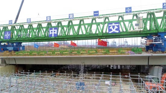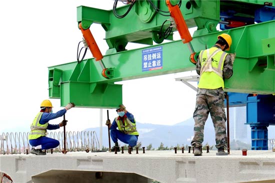 據介紹,預制構件在中交二航局中山預制廠集中預制,經過171公里船舶海運和3公里陸運至施工現(xiàn)場,采用中交二航局自主研發(fā)的TP120預制裝配式一體化架橋機進行裝配施工。該架橋機具有施工過程占地面積小、對沿線地面運輸條件要求低、操作平臺和調位系統(tǒng)精確可靠,以及上下部構件可同時安裝連接等優(yōu)勢,特別適用于城市交通繁忙地區(qū)的市政橋梁工程建設。