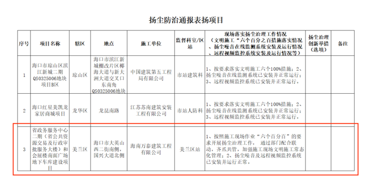 根據(jù)《2021年大氣治理沖刺階段管控措施清單》,海口市住建局對(duì)受監(jiān)在建項(xiàng)目工地進(jìn)行打分考核,列出第一批紅黑榜,對(duì)在揚(yáng)塵防治方面表現(xiàn)突出的前3名受監(jiān)在建項(xiàng)目工地記入??谑薪ㄖさ?fù)P塵治理“紅榜”,對(duì)排名在后5名的受監(jiān)在建項(xiàng)目工地記入??谑薪ㄖさ?fù)P塵治理“黑榜”。海南萬泰承建的省政務(wù)中心二期(省公共資源交易及行政審批服務(wù)大樓)和會(huì)展樓南面廣場(chǎng)地下車庫建設(shè)項(xiàng)目因按照施工現(xiàn)場(chǎng)作業(yè)“六個(gè)百分百”的要求開展揚(yáng)塵治理工作,通過部門配合聯(lián)動(dòng),齊抓共管,加強(qiáng)施工現(xiàn)場(chǎng)文明施工常態(tài)化管理,且揚(yáng)塵噪音及遠(yuǎn)程視頻監(jiān)控系統(tǒng)均以安裝并運(yùn)行正常等,榮登??谑薪ㄖさ?fù)P塵治理“紅榜”。