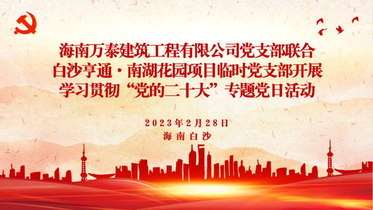 春暖花開,萬物可期。為學(xué)習(xí)貫徹落實(shí)黨的二十大會(huì)議精神,將黨建工作與業(yè)務(wù)工作有機(jī)結(jié)合,發(fā)揮基層黨組織戰(zhàn)斗堡壘的作用,在海南省質(zhì)安局的關(guān)心指導(dǎo)下,2023年2月28日,海南萬泰公司黨支部、工程部有關(guān)負(fù)責(zé)同志到項(xiàng)目部現(xiàn)場(chǎng)為白沙亨通·南湖花園項(xiàng)目黨建聯(lián)建共創(chuàng)基地舉行揭牌儀式,并聯(lián)合項(xiàng)目臨時(shí)黨支部開展了學(xué)習(xí)貫徹“黨的二十大”專題黨日活動(dòng),同時(shí),對(duì)項(xiàng)目工地的塔吊等重型機(jī)械進(jìn)行了安全檢查。