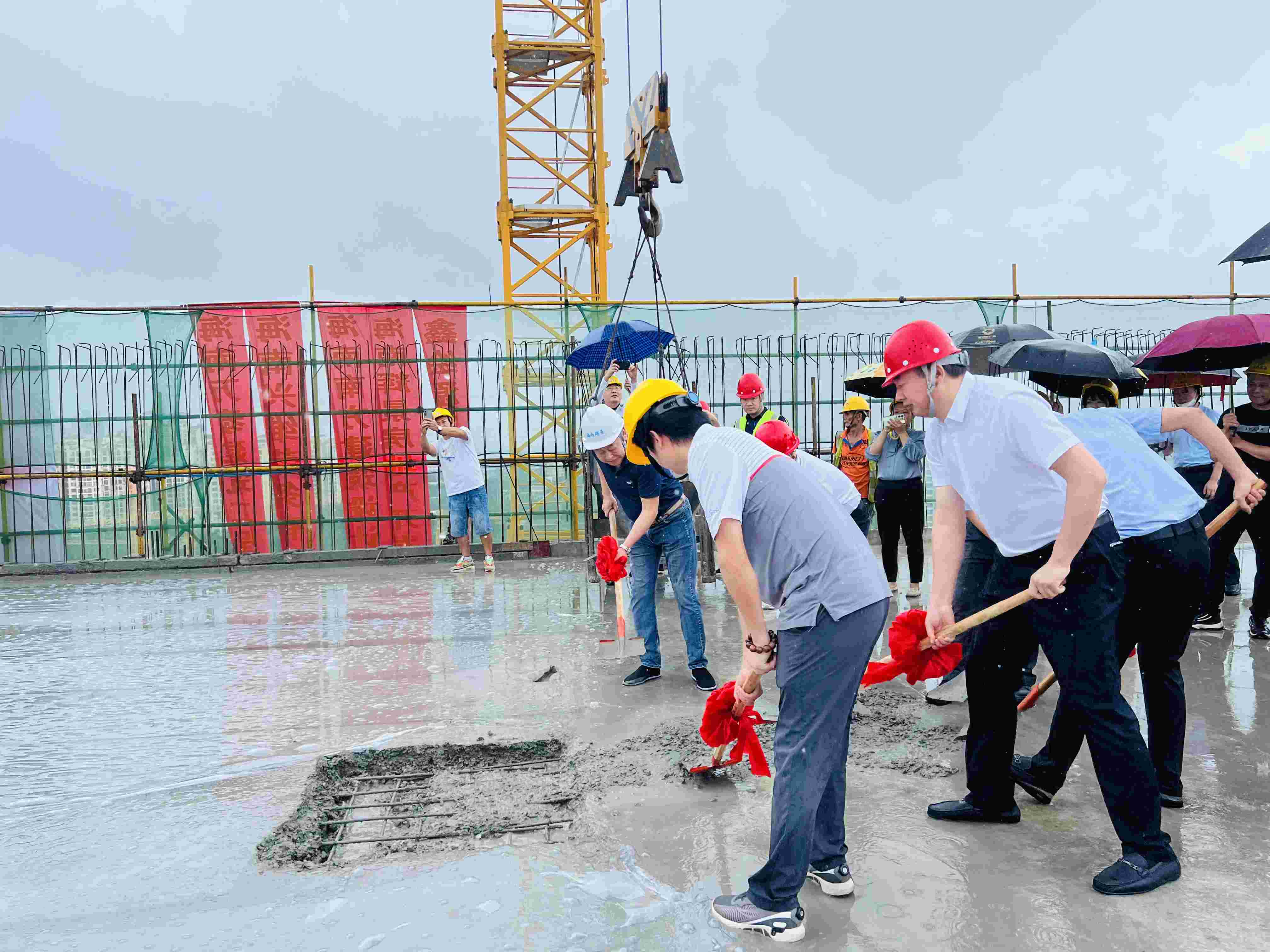 大家在做好安全防護(hù)措施后一起走上了頂樓,伴隨著禮花的炮鳴聲,共同為項目主體結(jié)構(gòu)的最后一塊區(qū)域澆筑混凝土。隨后,海南萬泰公司顏利總正式宣布項目主體結(jié)構(gòu)封頂成功。