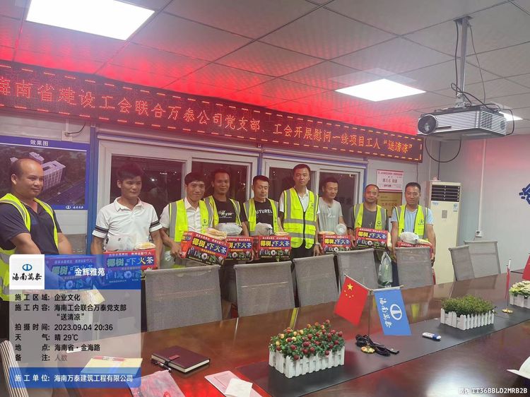 為深入貫徹落實習近平新時代中國特色社會主義思想,切實做好高溫天氣防暑降溫工作,保障一線項目工人的身體健康,確保安全文明施工,9月5日,在省建設(shè)工會的關(guān)心和支持下,海南萬泰建筑工程有限公司到公司承建的瓊海金輝雅苑、永成·和悅府項目部開展了慰問一線項目工人“送清涼”活動。公司黨支部、工會、總經(jīng)辦、工程部以及項目負責人、一線工人等參加本次活動。
