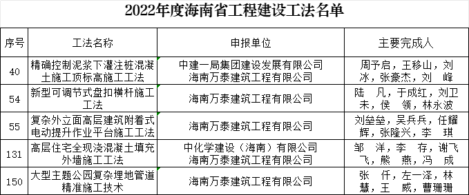 近日,由海南萬泰建筑工程有限公司申報的《大型主體公園復雜埋地管道精準施工技術》《復雜外立面高層建筑附著式電動提升作業(yè)平臺施工工法》《高層住宅全現(xiàn)澆混凝土填充外墻施工工法》《精確控制泥漿下灌注樁混凝土施工頂標高施工工法》《新型可調節(jié)式盤扣橫桿施工工法》共5項省級工法通過省住建廳評審,并頒發(fā)了相應省級工法證書。據(jù)悉,這5項省級工法是公司的個別工程項目經過實踐總結出來的技術成果,具有良好的安全性、經濟性和適用性,可提高工效、縮短工期、大幅降低工程成本。此次通過的省級工法,是萬泰在工程施工技術方面的重大創(chuàng)新,后續(xù)我司將廣泛推廣至各工程項目中加以應用。