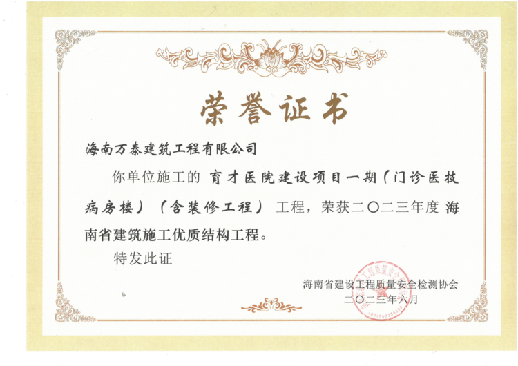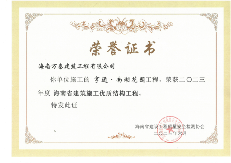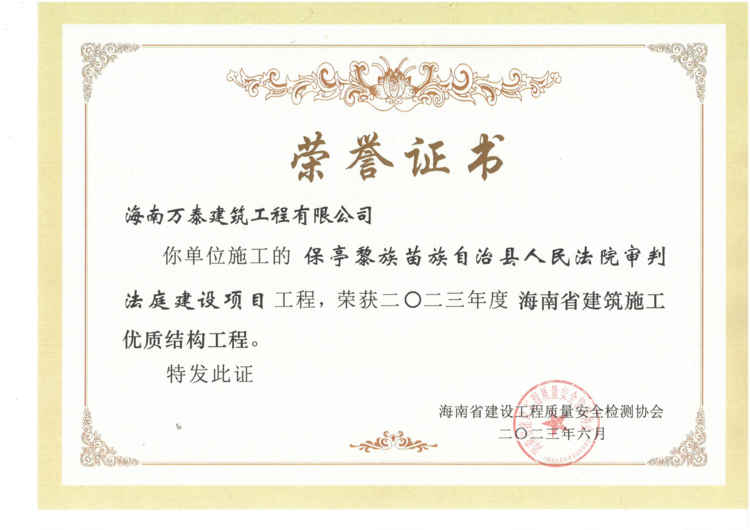 近日,由公司承建的育才醫(yī)院建設項目一期、保亭黎族苗族自治縣人民法院審判法庭建設項目、亨通·南湖花園分別通過了海南省建設工程質量安全檢測協(xié)會的評審,被評為“2023年度海南省建筑施工優(yōu)質結構工程”。該獎項代表著全省建筑工程結構施工質量的領先水平,是精品工程的重要標志。