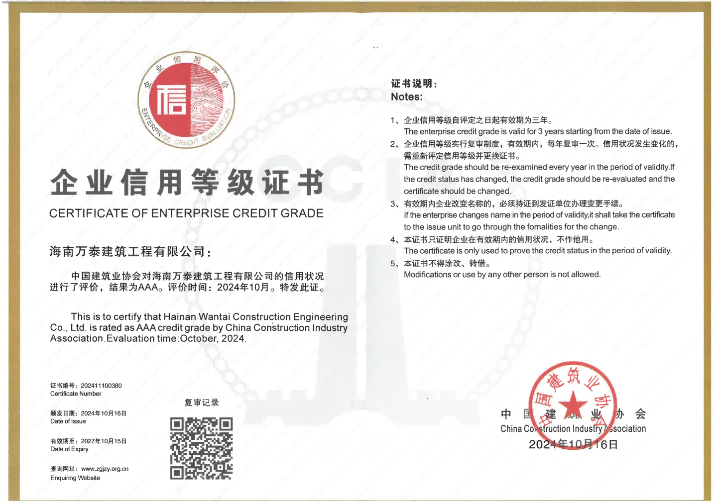 秋高氣爽,喜結(jié)碩果。近日,中國建筑業(yè)協(xié)會(huì)公布了2024年度中國建筑業(yè)AAA級(jí)信用企業(yè)名單。海南萬泰建筑工程有限公司榜上有名,成功獲評(píng)“ 2024年度中國建筑業(yè)AAA級(jí)信用企業(yè)”榮譽(yù)稱號(hào)!這是公司繼2021年首次獲評(píng)后再次獲評(píng)該稱號(hào)。