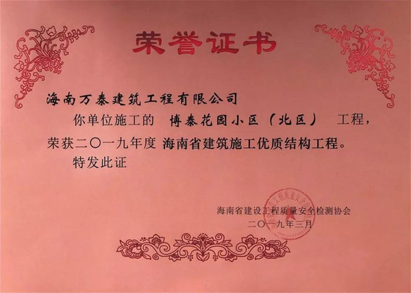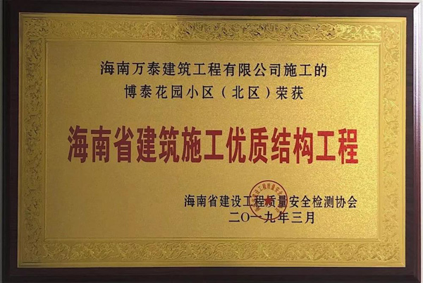 博泰花園小區(qū)(北區(qū))“海南省建筑施工優(yōu)質(zhì)結(jié)構(gòu)”獎(jiǎng)