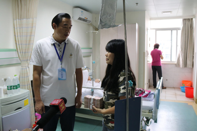 “這是萬泰公司張總和同事們的一點(diǎn)心意,小鄭,祝你愛人早日康復(fù),希望萬泰這個(gè)大家庭能更多的幫助你們這個(gè)小家庭渡過難關(guān),也期盼你早日重返工作崗位……”2016年7月14日下午,海南萬泰建筑工程有限公司常務(wù)副總顏利,代表萬泰公司張總及全體員工到海南省人民醫(yī)院看望萬泰員工鄭琳及患病家屬曾維龍,并送上萬泰張總及全體員工的十萬元愛心捐款。海南省電視臺直播海南節(jié)目全程報(bào)道。