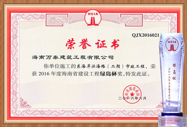 2016年6月13日,由海南萬(wàn)泰承建的東海岸濱海路(二期)市政工程順利通過(guò)公示,喜獲海南省建設(shè)工程“綠島杯”獎(jiǎng)項(xiàng)。