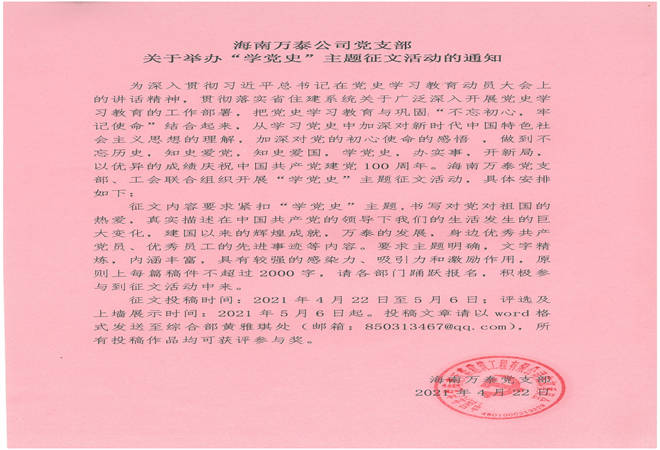 自4月22日起,海南萬泰黨支部、工會聯(lián)合開展“學(xué)黨史”主題征文活動?;顒油ㄖl(fā)布后,廣大黨員、職工踴躍報名、積極投稿,參加了此次活動。