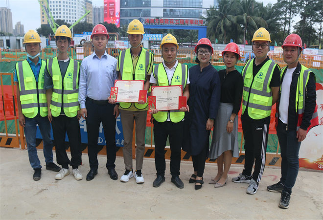 3月25日上午,根據(jù)公司安排,黨支部、工會(huì)前往省政務(wù)中心項(xiàng)目工地現(xiàn)場,為參加省人力資源開發(fā)局聯(lián)合省建設(shè)工會(huì)主辦的“2020年海南省行業(yè)職業(yè)技能競賽---建筑行業(yè)職業(yè)技能競賽”并獲得砌筑二等獎(jiǎng)、三等獎(jiǎng)的周宗清、李業(yè)倫頒發(fā)榮譽(yù)證書、高級(jí)工職業(yè)資格證書和現(xiàn)金獎(jiǎng)勵(lì)。